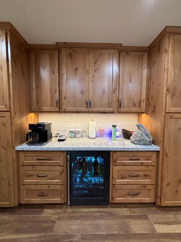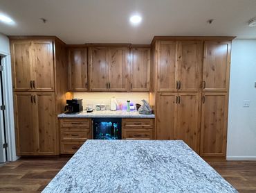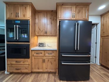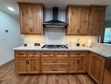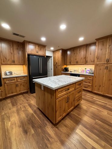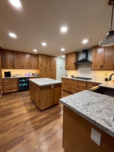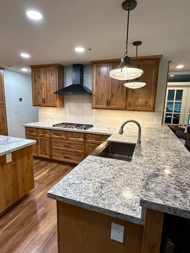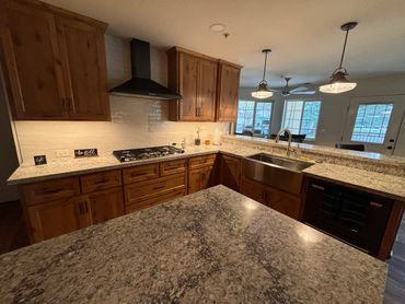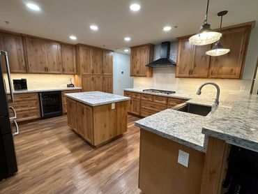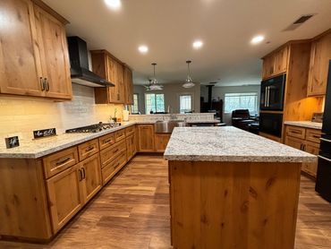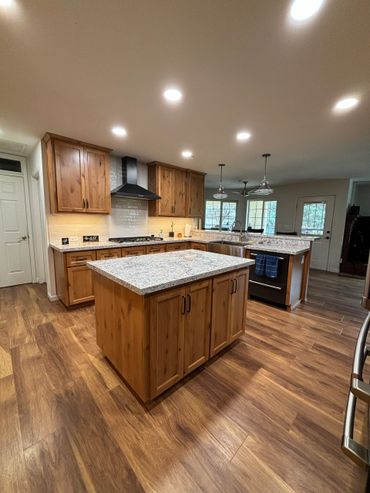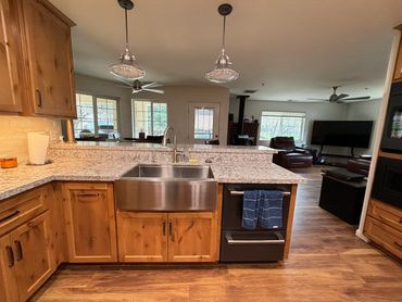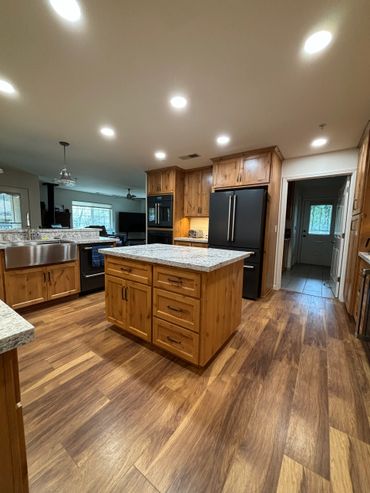 This kitchen remodel strikes the perfect balance between rustic warmth and modern sophistication. Rich natural wood cabinetry pairs beautifully with durable granite countertops, creating a timeless design built to last. The central island adds both functionality and style, offering additional storage and prep space. A farmhouse-style stainless steel sink and matte black appliances bring a modern edge, while pendant and recessed lighting ensure the space is bright, inviting, and practical. Designed with an open layout, the kitchen flows seamlessly into the living area—making it as ideal for everyday use as it is for entertaining.